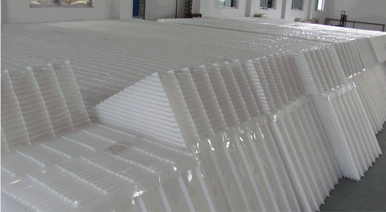 斜板填料主要由共聚及聚丙烯材料混合制成。從淺層理論的基礎(chǔ)講,在斜板上部設置沉淀距離合理的沉淀段,在下部控制斜板的幾何形狀,使斜板下部形成穩(wěn)定的接觸絮凝段,通過接觸作用和淺池沉淀機理達到礬花與水分離的目的。各種間距斜板填料均是通過不同高度的塑料肋條來支撐斜板片,肋條與斜板熱熔焊接,每兩層斜板片之間需要多根肋條支撐,組裝工藝復雜,而且傳統(tǒng)斜板內(nèi)部水流流道成矩形,常適用于上向流沉淀池。 斜板填料規(guī)格參考表(備注:斜長為1m計算) 片厚(單位:mm) 平板(單位:張) 重量(單位:kg) 肋條(單位:根) (板間距)25 0.8 32 33 7 1 32 39 7 (板間距)28 0.8 30 32 7 1 30 37 7 (板間距)30 0.8 28 30 7 1 28 35 7 (板間距)50 1 18 26 7 (板間距)80 1.5 11 25 7 (板間距)100 2 8 24 7